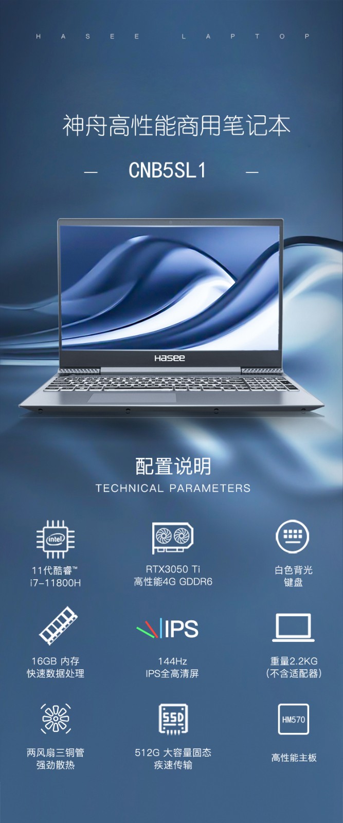 神舟CNB5SL1高性能商用笔记本/i7-11800H/16G内存/512GBSSD/RTX3050Ti4GGDDR6独显/无线网卡/15.6寸窄 自营