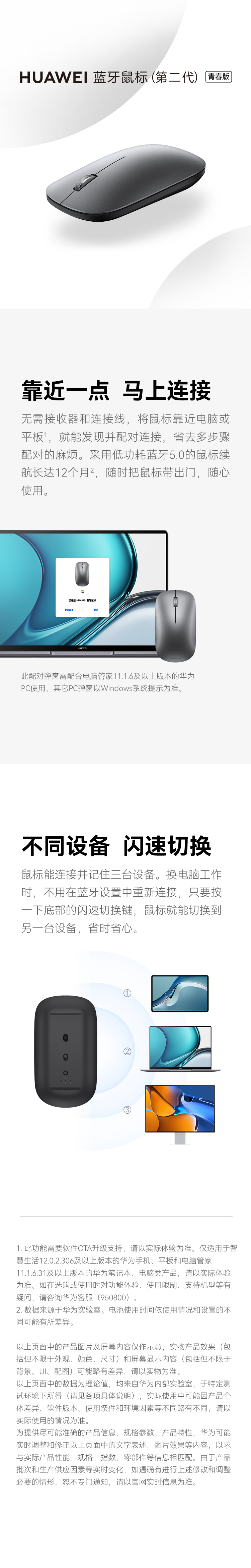 ¥79.00华为蓝牙鼠标(第二代)青春版 无线鼠标 台式机笔记本鼠标 适配MateBook全系笔记本电脑 灰色