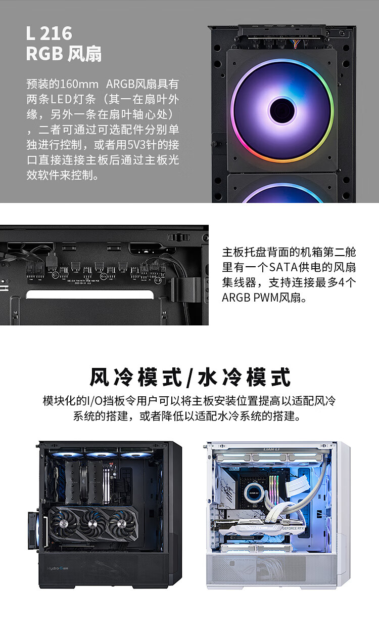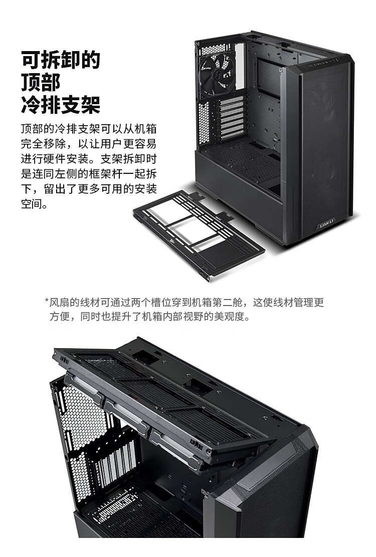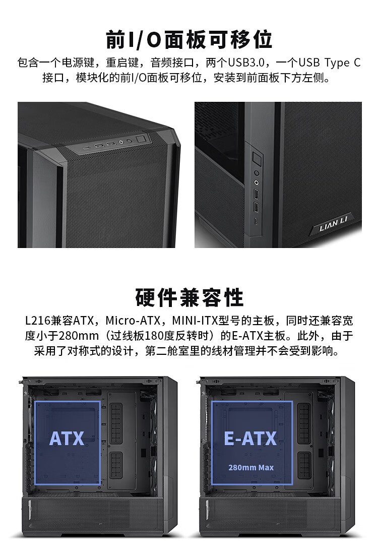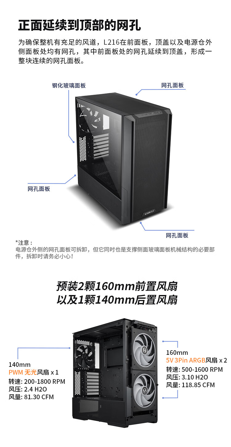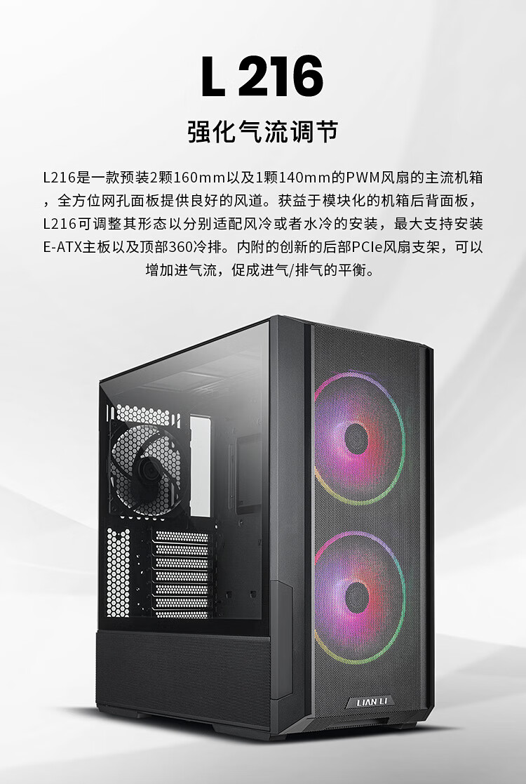 LIANLI 联力 L216 黑色 中塔式台式电竞游戏机箱 标配3把风扇/支持E-ATX主板竖装显卡360水冷/一体式网孔面板 自营