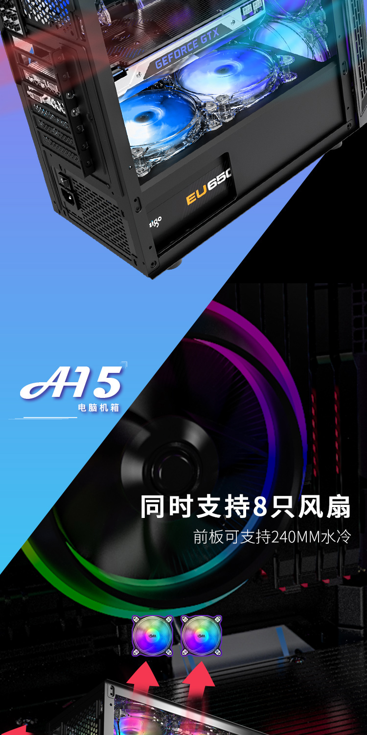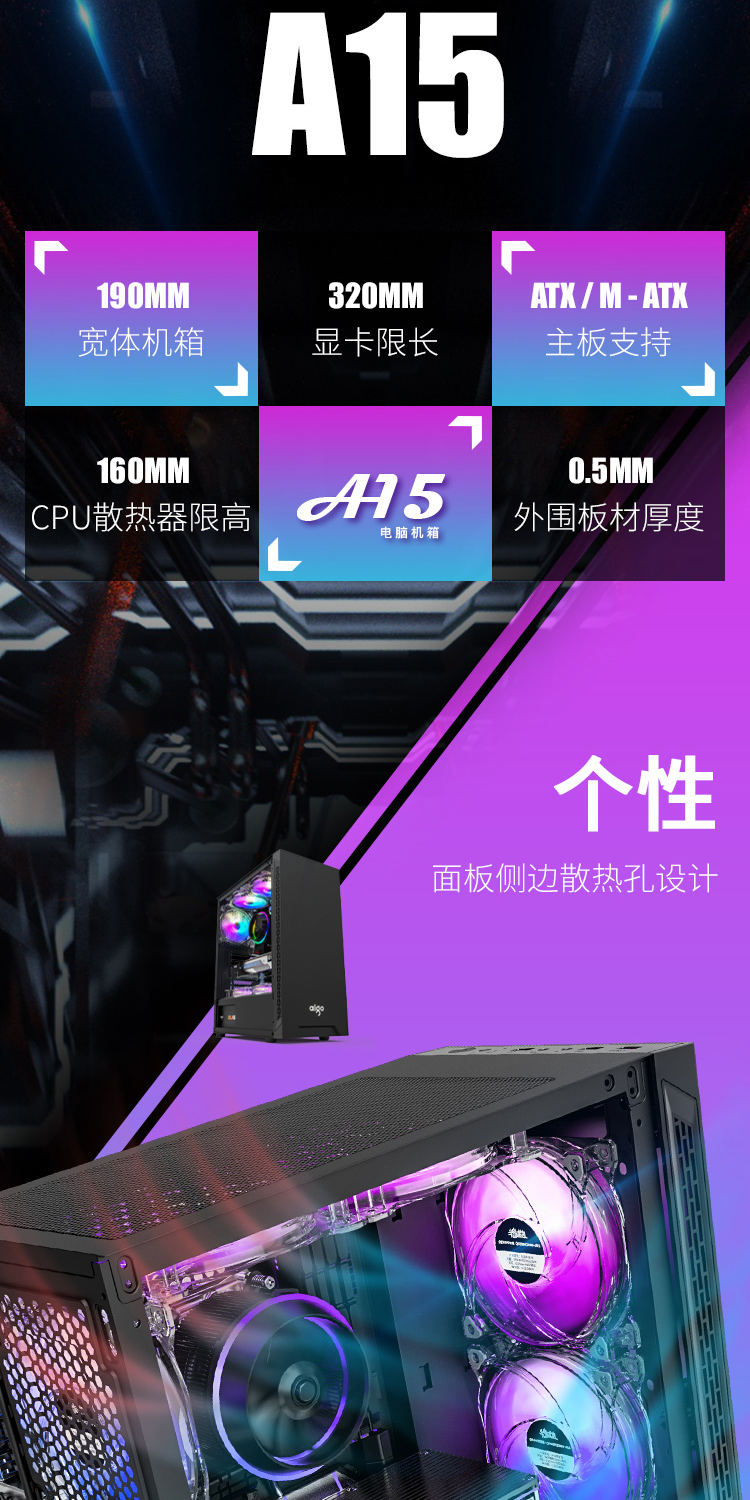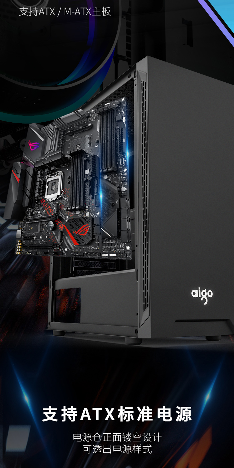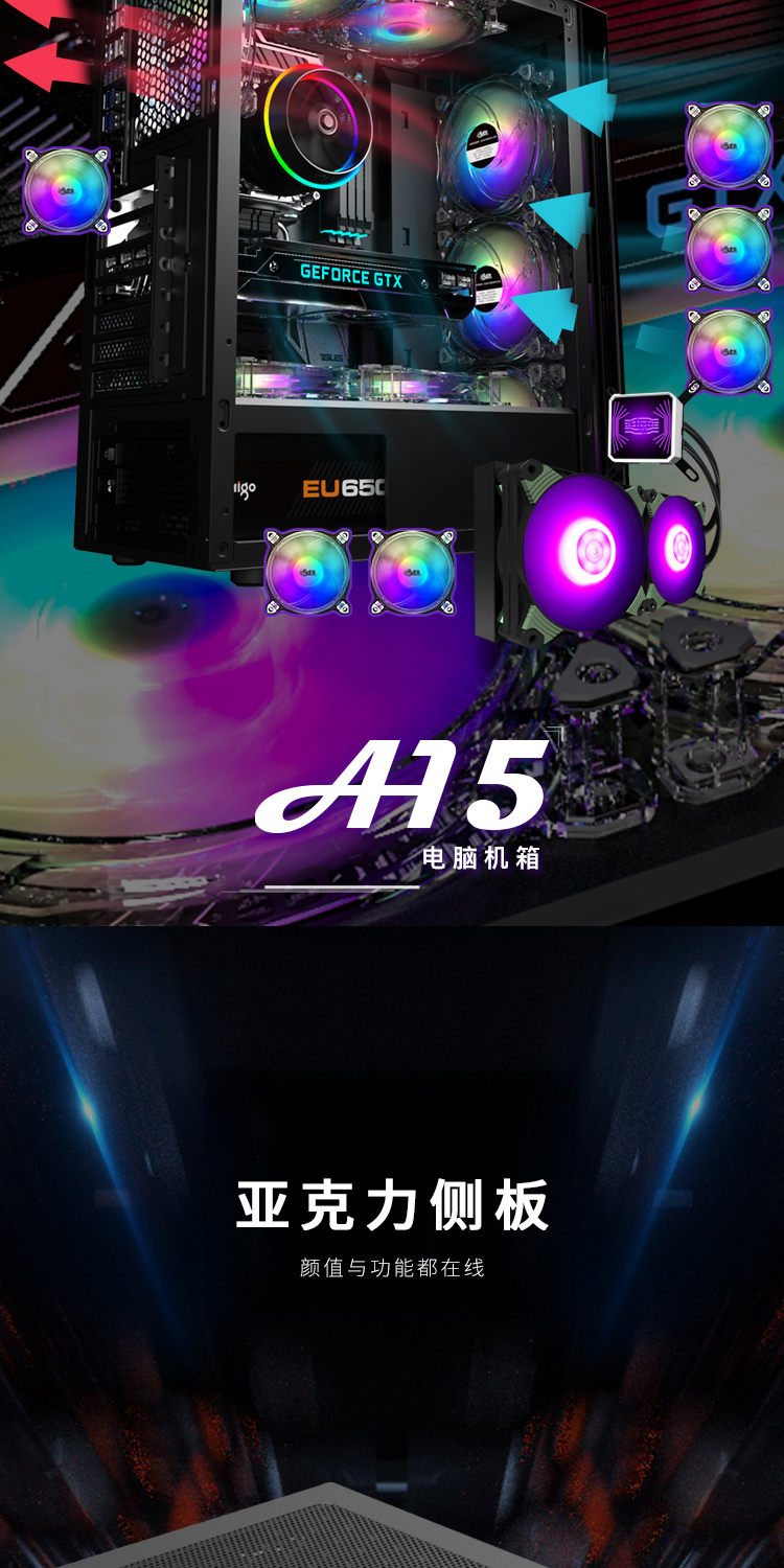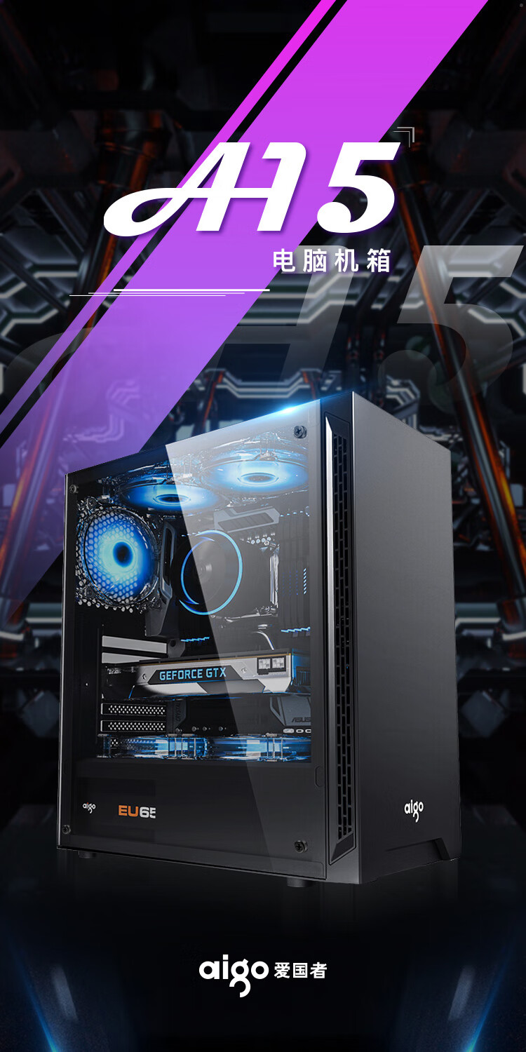 ¥399.00爱国者(aigo)A15全侧透 黑色分体式游戏办公电脑机箱/支持ATX主板/亚克力全侧透/240冷排/可走背线