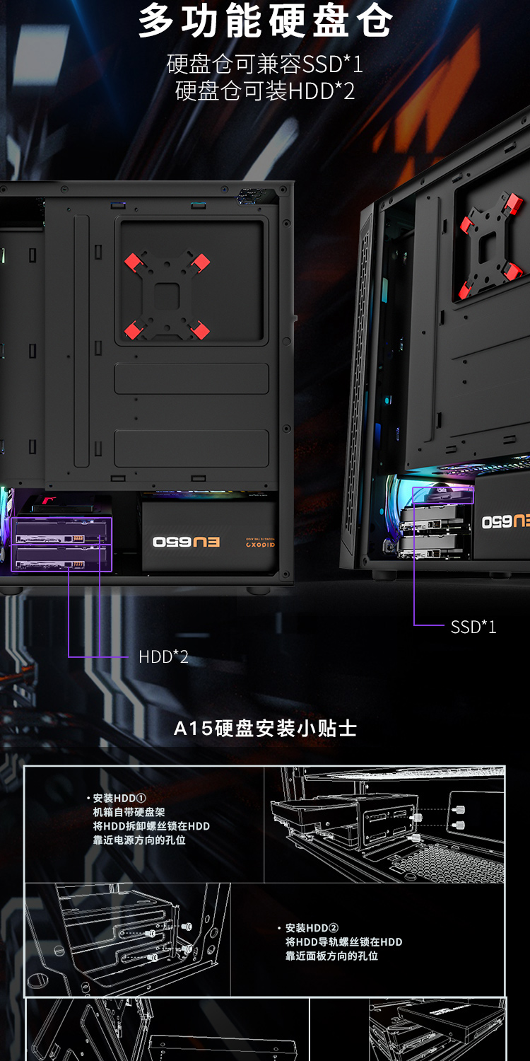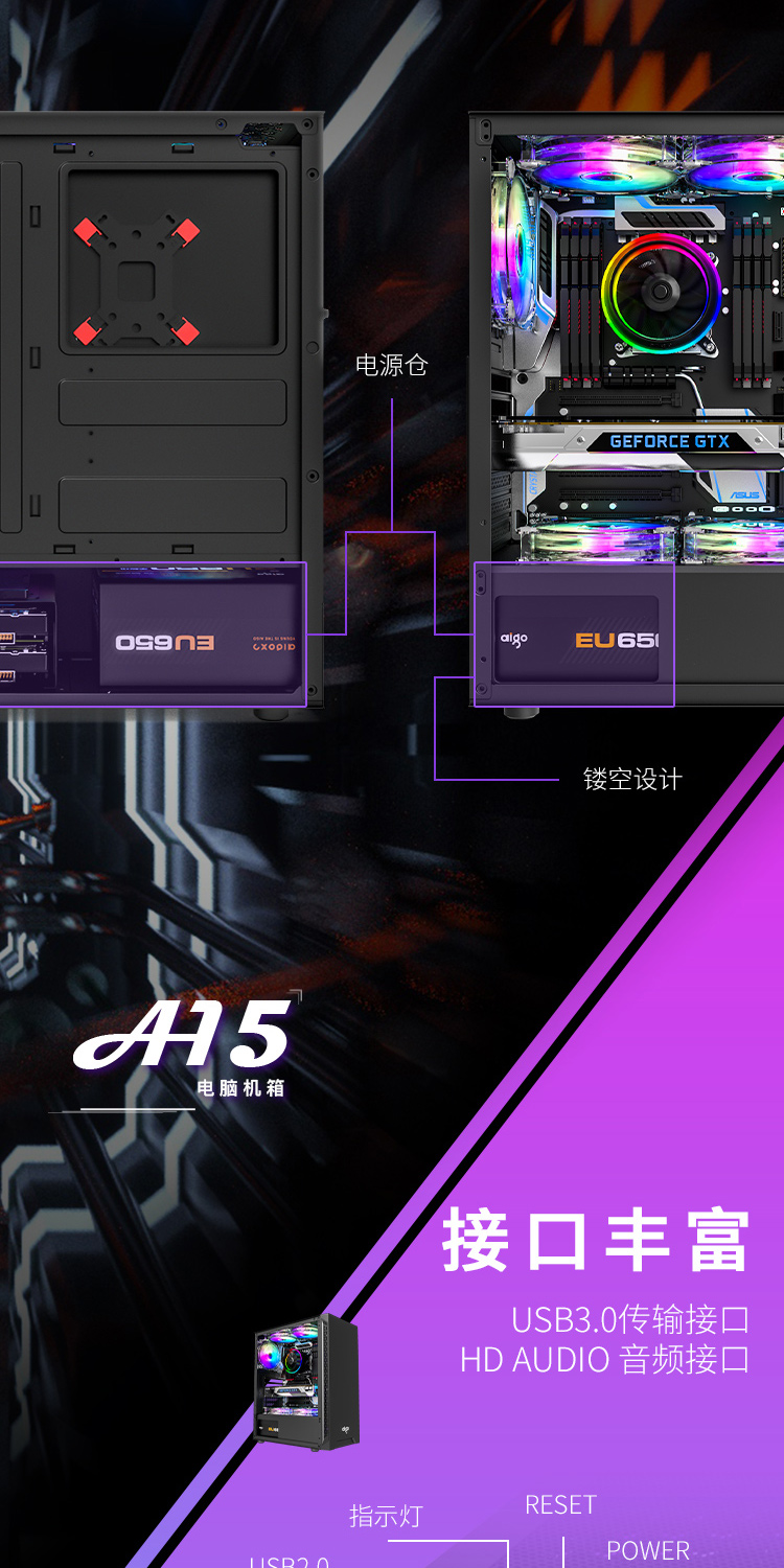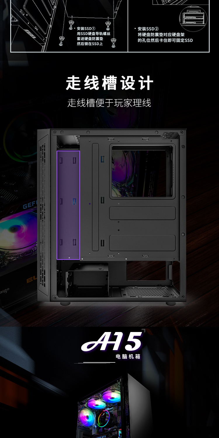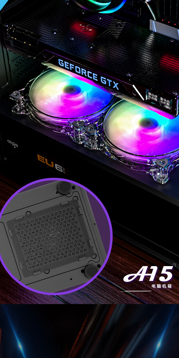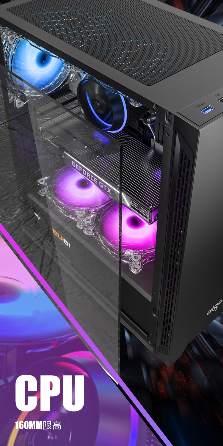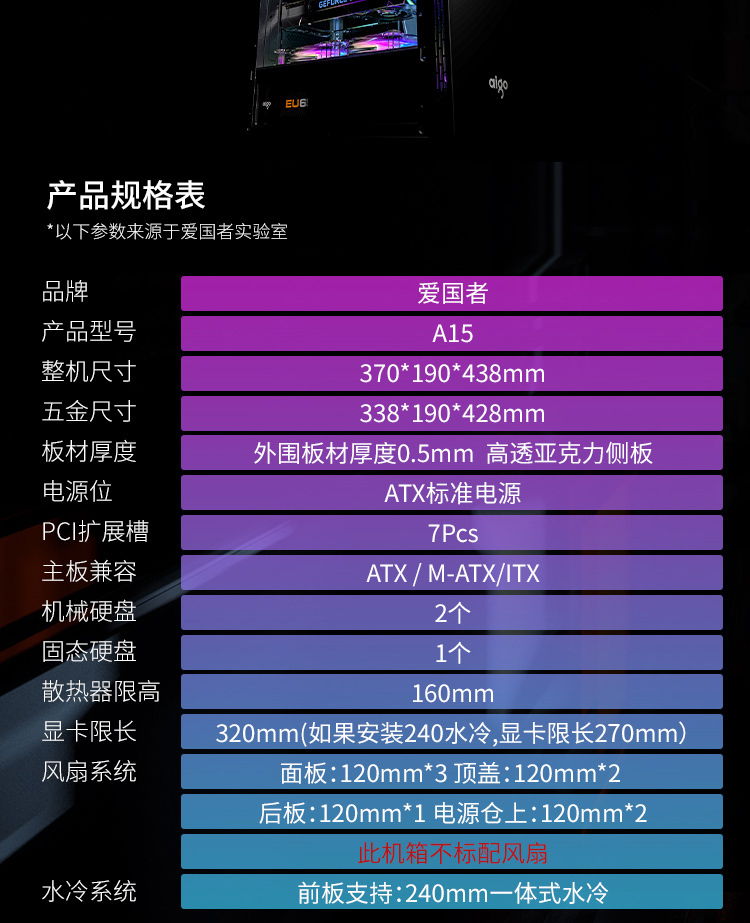 ¥399.00爱国者(aigo)A15全侧透 黑色分体式游戏办公电脑机箱/支持ATX主板/亚克力全侧透/240冷排/可走背线